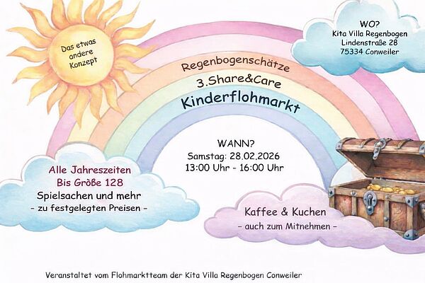 Am kommenden Samstag, den 28. Februar veranstaltet der Elternbeirat der Kita Villa Regenbogen mit Unterstützung der Eltern und Mitarbeitenden der Kita ihren bereits 3. Share & Care Flohmarkt. Von 13:00 bis 16:00 Uhr öffnen sich die Türen für alle Bürgerinnen und Bürger um bei Kaffee & Kuchen das ein oder andere Schnäppchen zu ergattern. Wir laden Sie herzlich zu einem Besuch ein und freuen uns über interessante Begegnungen, tolle Gespräche und für Sie gute Schnäppchen.