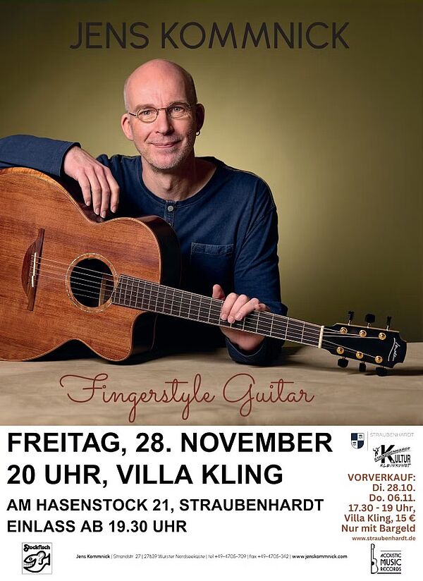 Jens Kommnick spielt seit 45 Jahren akustische Gitarre. Er gilt als führender Vertreter des Celtic Fingerstyle, der es versteht, auch Einflüsse aus Klassik, Jazz und Rock in seine filigranen Gitarrenklänge einfließen zu lassen. Sein Debut-Album „Siúnta“ von 2008 wurde international mit überragenden Kritiken bedacht, Radiostationen im In- und Ausland spielen seine Musik. Seine Zusammenarbeit mit Reinhard Mey machte ihn zusätzlich populär und sein Soloalbum „Kommnick spielt Mey“ von 2011 erhielt glänzende Rezensionen. 2012 wurde er – als erster und einziger Deutscher in der Geschichte – mit seiner Gitarre „All Ireland Champion“, und dies gleich doppelt: sowohl als Solist als auch als Begleiter. Auch sein drittes Album „redwood“ von 2015 begeisterte und erhielt den begehrten „Preis der deutschen Schallplattenkritik“. 2022 veröffentlichte der Musiker auf dem renommierten Stockfisch-Label seine vierte Produktion „Stringed“ und wurde dafür erneut für den Preis der deutschen Schallplattenkritik ausgezeichnet. Jens Kommnick arbeitete mit den hochkarätigsten Vertreterinnen und Vertretern seiner Zunft zusammen (neben Reinhard Mey auch Werner Lämmerhirt †, Ian Melrose, Peter Finger, Allan Taylor, Klaus Weiland, Ulli Bögershausen) und dürfte aufgrund der Mitwirkung an mittlerweile knapp 100 CD-Produktionen unterschiedlichsten akustischen Stils (Irish Traditional & Contemporary, Fingerstyle-Gitarre, Klassik, Singer- Songwriter, Musik für Kinder) landesweit einer der wohl meistgefragtesten Studiomusiker dieser Szene sein. Zudem arbeitet er als Gitarren-, Bouzouki- und Whistle-Dozent auf zahlreichen Workshops in der ganzen Republik und im europäischen Ausland. Seine angenehme Bühnenausstrahlung und humorvolle Präsentation machen seine Konzerte für das Publikum darüber hinaus zu einem besonderen Vergnügen. Freuen Sie sich daher auf eine hochkarätige Veranstaltung von Kultur und Kleinkunst Straubenhardt am 28. November!