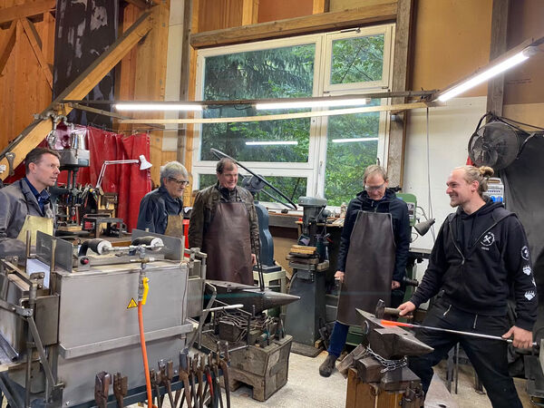 Ein ganz anderes, aber ebenso faszinierendes Bild bot sich in der Schmiede TATA. Dort empfing Fabian Weber die Gruppe und führte zunächst anschaulich vor, wie traditionelles Schmiedehandwerk funktioniert. Im Anschluss hatten auch die Gäste Gelegenheit, selbst den Hammer zu schwingen und am Amboss Hand anzulegen – ein Erlebnis, das bei vielen für Begeisterung sorgte.