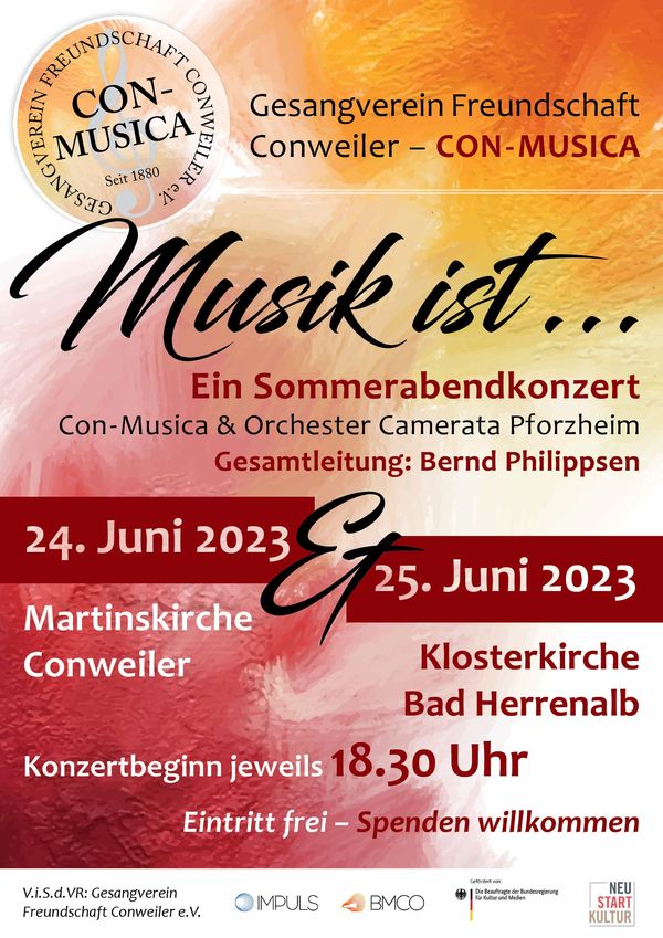 Conweiler/Bad Herrenalb - Ein musikalisches Highlight erwartet die Bewohner der Region: Am 24. Juni 2023 in der Martinskirche in Conweiler und am 25. Juni 2023 in der Klosterkirche in Bad Herrenalb findet jeweils um 18:30 Uhr ein Sommerabendkonzert statt. Der Chor Con-Musica aus Straubenhardt und das Streichquartett der Camerata Pforzheim unter der musikalischen Leitung von Bernd Philippsen versprechen ein unvergessliches Erlebnis.